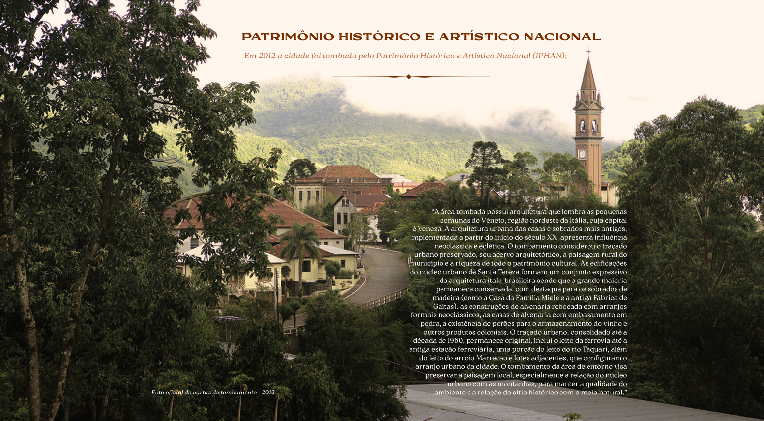 Santa Tereza tem um dos mais importantes núcleos de imigração italiana do Brasil. Sua arquitetura eclética mantém os elementos culturais trazidos do norte da Itália sendo frequentemente comparada à das aldeias dessa região.