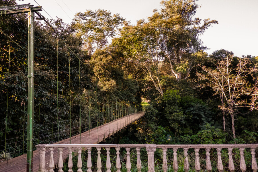 Suspensa por cabos de aço e plataforma em madeira, possui extensão de 50 metros, situada sobre o Rio “Barramansa”. Antes dela existia uma ponte em madeira suspensa por cordas e com a largura de 60 centímetros, ou seja, somente para passagem de pessoas. O Professor Felice Montanari, correspondente do jornal Il Corriere D’Italia, relata que, em agosto de 1917, a nova ponte sobre o “Barramansa” foi concluída, obra realizada pelo Intendente do município, Sr. Cel. Antônio J. Marques de Carvalho Junior, que havia criado o Distrito de Santa Tereza em 15/10/1916. A Ponte facilitou, sobremaneira, as atividades do Moinho Valduga, de propriedade do Sr. Olimpio Valduga, o qual funcionava com turbinas movidas pelas águas do “Barramansa”, desviadas através de um canal paralelo, construído especialmente para movimentar o maquinário. Ainda é possível identificar o leito do canal que inicia próximo à RSC 444, percorrendo trechos da estrada, na margem direita, subindo o rio. Em março de 1917 o Sr. Olimpio Valduga realizou o primeiro teste de iluminação com corrente elétrica, gerada por um dínamo com capacidade para 50 lâmpadas, suficiente para iluminar toda Vila. O teste foi realizado no Hotel de Vittorio Viccari. Parte do maquinário antigo permanece na construção que sofreu alterações devido às reformas realizadas. A propriedade do imóvel pertence atualmente à família de Darmos Olympio Valduga, também Subprefeito de Santa Tereza entre 1989/92. Lote 2 Sul.